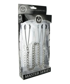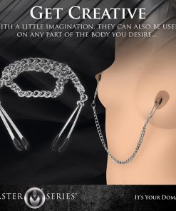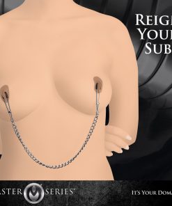 These sexy tweezer nipple clamps are designed to exert either light or strong pressure with a simple sliding clamp. Vinyl coated ends attached to a linked chain. Your plaything will love the variation between light and intense pressure, and the chain serves as a visual adornment for a sensual look.