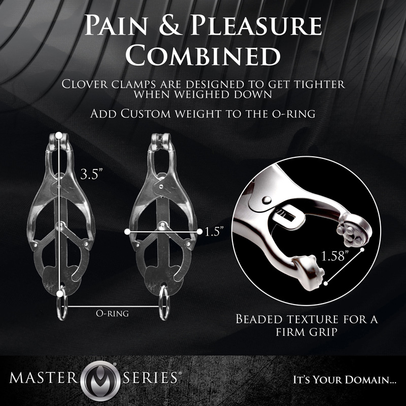 A comely device of restriction and paradise. The Ringed Monarch is an effective training tool in the art of endurance and sensation play. These devious chrome clover-style clamps are ideal for solo play or with the one you want to dominate. When the O-ring is pulled, the clamps pressure becomes more intense. Use your imagination, this devious set includes a convenient O-ring that can be weighted, laced, and more. In your domain: you decide.