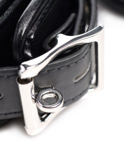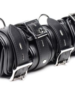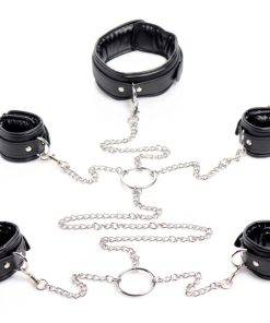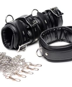 Limit your slaves mobility and remind them of your total control with an attractive and comfortable shackle set. The leather-like collar and 4 cuffs feature internal padding, adjustability, and locking buckles. All five accessories are connected via their D-rings and swiveling clasps to a series of chains to create a full-body restraint. Privately appreciate or show off your plaything in beautiful bondage when you keep them on their feet or force them on all fours.
