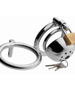 Lock up his dick in solitary confinement! His cock will not be getting any attention while it is trapped in this intensely constricting chastity device. Yank his cock and balls through one of the two base rings, sized differently to fit your submissive the way you like it. Lock the shaft portion of the cage in place, squeezing his flaccid cock for the ultimate incarceration. Now he is completely at your mercy, unable to find release unless you allow him to. This sturdy stainless steel cage can be worn for as long as you desire, with a faucet feature that allows him to urinate. His cock belongs to you… and you hold the key!