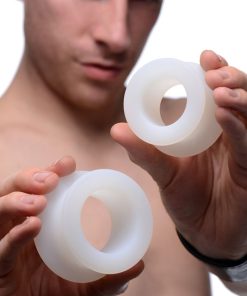 Train that hole! These ass grommets will keep it spread wide open, leaving the insides exposed for penetration, liquid play, or just an innocent peek inside! Two are included so that you can start with the smaller grommet and work your way to the larger. The firm, yet flexible material keeps the opening of the hole pried open for an enjoyable stretching sensation. This unique training set is ideal for advanced anal enthusiasts. Made of premium silicone, they are non-porous and phthalate-free. Clean after use with mild soap or toy-cleaner and avoid use with silicone lubricants.
