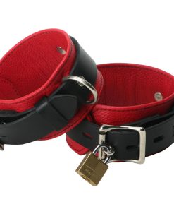 Fantastic style meets comfort, functionality, and durability with our new Strict Leather Black and Red Locking Cuffs. These cuffs are made of red garment leather with black reinforced stitching. These cuffs use a locking buckle, so you can add more security by placing a padlock through the buckle. Now you can be sure that your partner will not be able to remove them without the key. There is a D-ring so you can attach the cuffs to each other or to other bondage gear. They are just like our Black Leather Deluxe Cuffs but with a more eye catching color scheme.