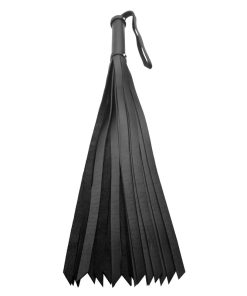 This simple leather flogger has about 18 strands, each 18 inches long and 0.5 inch wide. Each strand is cut at an angle for a little extra bite. A generously sized wrist loops ensures a firm grip, and the 6 inch long leather wrapped handle is decorated with silver studs. Measurements: 24 inches in total length, tails measure 18 inches... Read more
