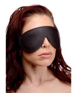 This blindfold is made of black leather and padded in the inside for a comfortable fit and more effectively obscured vision. It is held in place by a black elastic band. It is a perfectly dependable, long lasting blind fold.