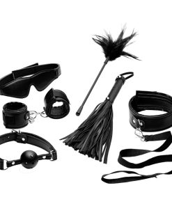 Note: Set contains feather tickler, black out blindfold, ball gag, two cuffs, collar, and leash