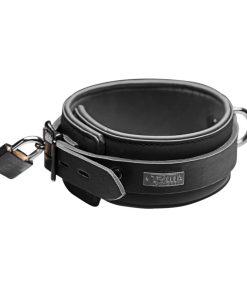 This sturdy Neoprene collar offers comfortable restriction with classic style. Double layered for strength, it features a metal plate that spells out Tom of Finland on the side. There is a D-ring attached to the front, just waiting for the matching leash, sold separately. Fully adjustable, the band is topped by a locking buckle, with a Tom of Finland padlock and keys included for immediate use. Matching wrist and ankle cuffs available separately.