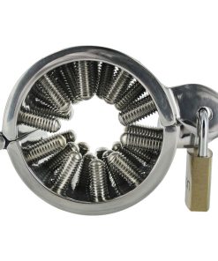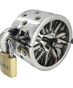 This is a heavy-duty stainless steel CBT device that is perforated with 28 holes through which adjustable screw points can be threaded to put the pressure on your sub. The sturdy construction means that this ring offers no quarter to your flesh puppet, and as the lock slides into place they will become utterly at your mercy. The screw points have blunted ends to avoid piercing sensitive flesh while still pressing in on their package. The points are fully adjustable with the included hex key: start with them withdrawn all the way, then put Toms Spikes to work as you begin to tighten them up to inflict as little or as much discipline as you desire. They can even be removed entirely and becomes a smooth steel cock ring or ball stretcher.